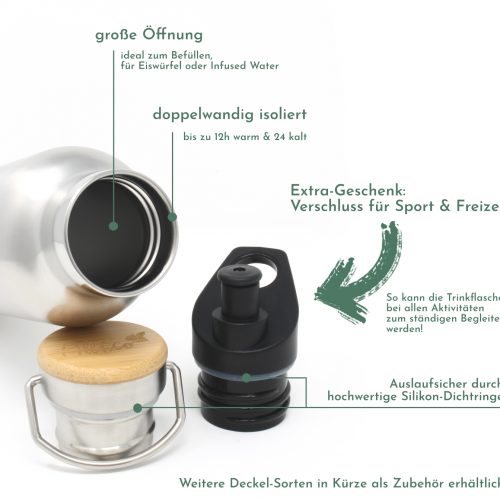 Unser zusätzliches Geschenk an Dich! So machst Du aus der Thermosflasche nicht nur eine isolierte Wasserflasche, sondern im Handumdrehen eine Edelstahl Sport Trinkflasche, die auch als Trinkflasche für kohlensäurehaltige Getränke geeignet ist. Egal ob als Sport Trinkflasche, für Camping, Wandern, oder als Smoothie Flasche. Die Edelstahl Thermosflasche wird dein Treuer Begleiter, mit dem Du sämtliche Flaschen ersetzen kannst. 😉