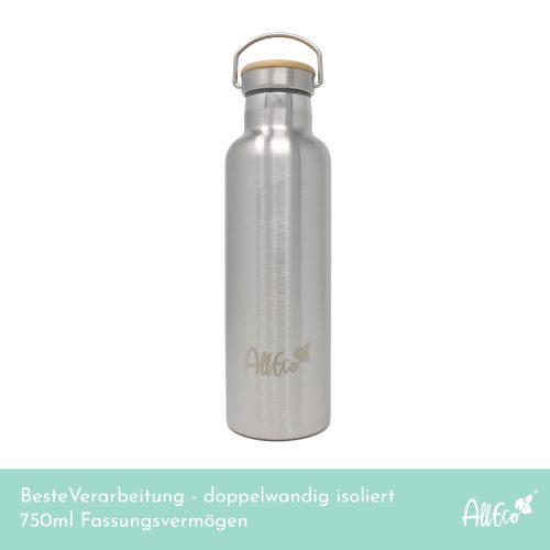 Die Edelstahl Trinkflasche kann sicher verschlossen werden und ist sehr widerstandfähig. Die Thermosflasche kann mit dem praktischen Henkel überall befestigt werden und geht auf Reisen oder beim Ausflug nicht verloren. Beim Wandern oder in der kalten Jahreszeit auch ideal als Thermoskanne oder Tee Flasche geeignet. Die perfekte Kombi: Ergänze die Edelstahl Trinkflasche mit unseren doppelwandige Edelstahlbecher – schau hierfür in unserem Shop vorbei!