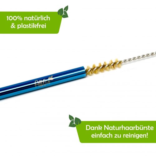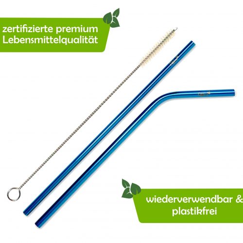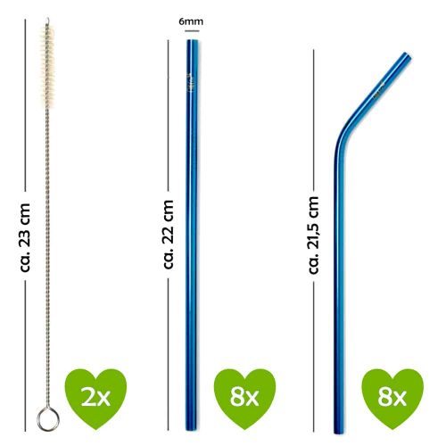Edelstahl Strohhalm 16er Set blau + 2 Reinigungsbürsten + Eco-Beutel